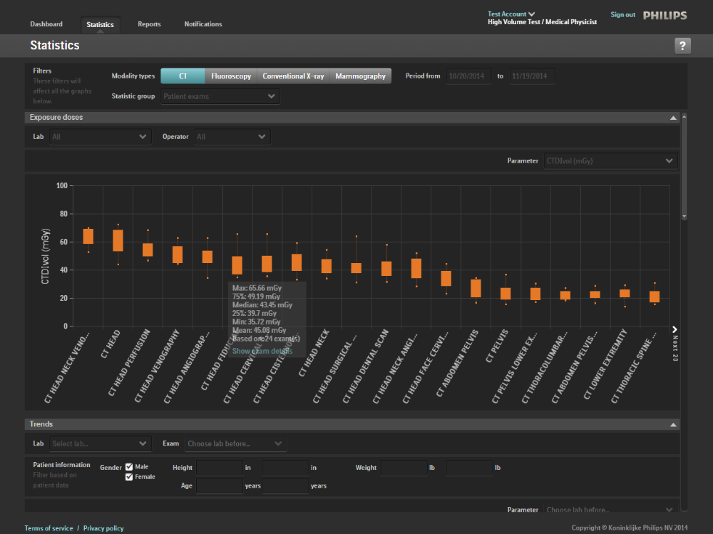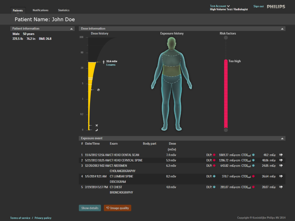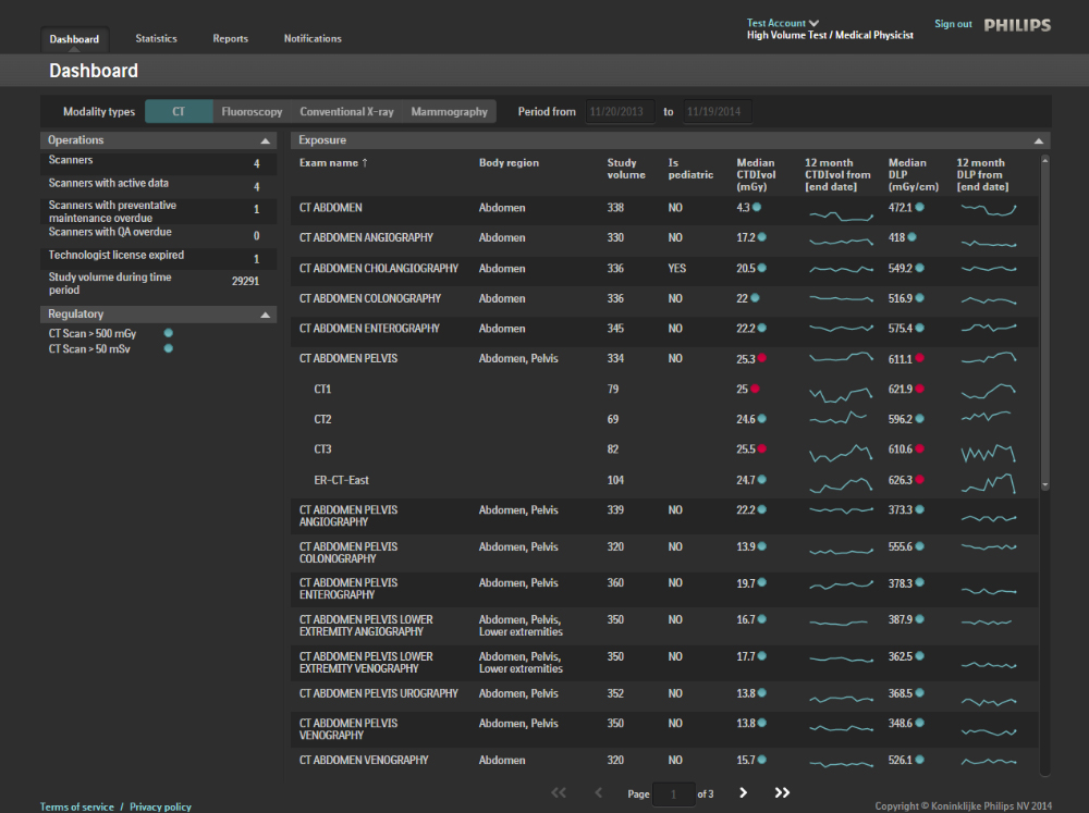 Toma el control de gestión de las dosis para toda la organización. DoseWise Portal es un sistema integral de gestión de las dosis de radiación que hace más eficiente la recolección de datos la exposición del paciente y el personal y la analítica para mejorar la seguridad y facilitar el cumplimiento de la normativa. *Producto en desarrollo. Todavía no disponible para la venta.